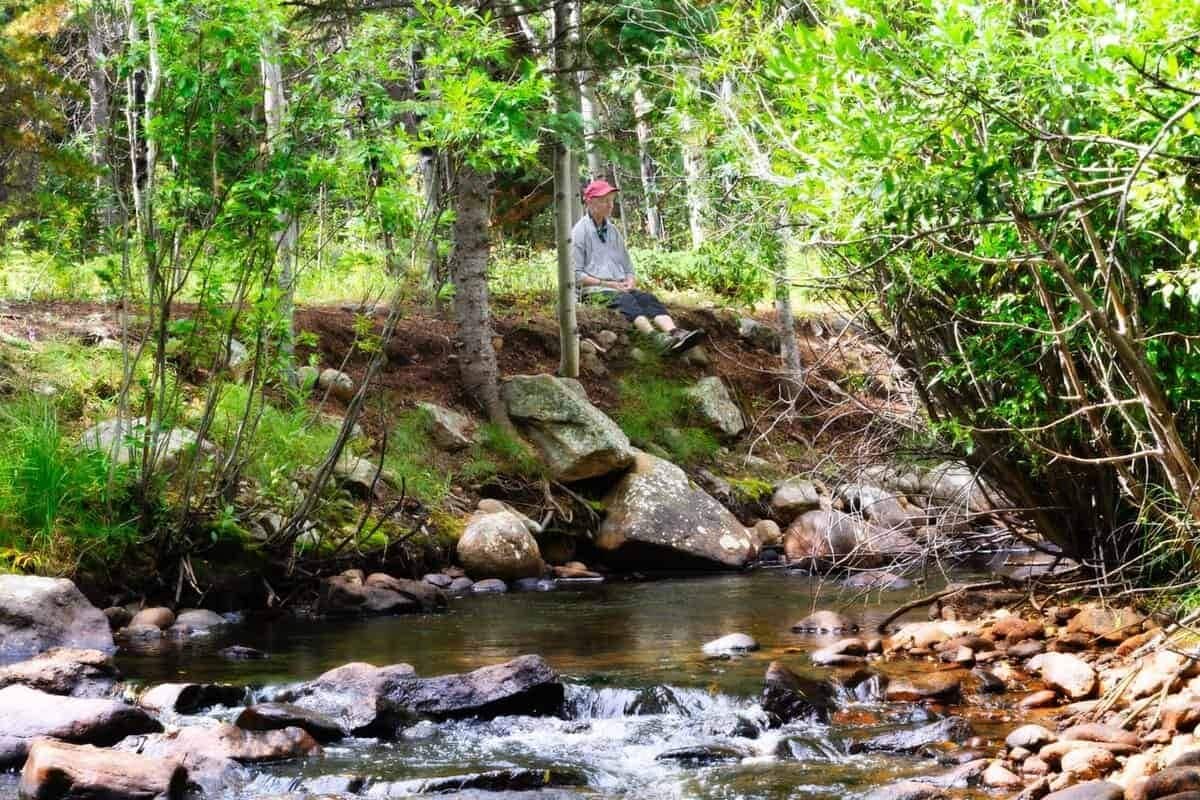 Here the creek is at its summer low, but in spring flood it can reach her shoes.